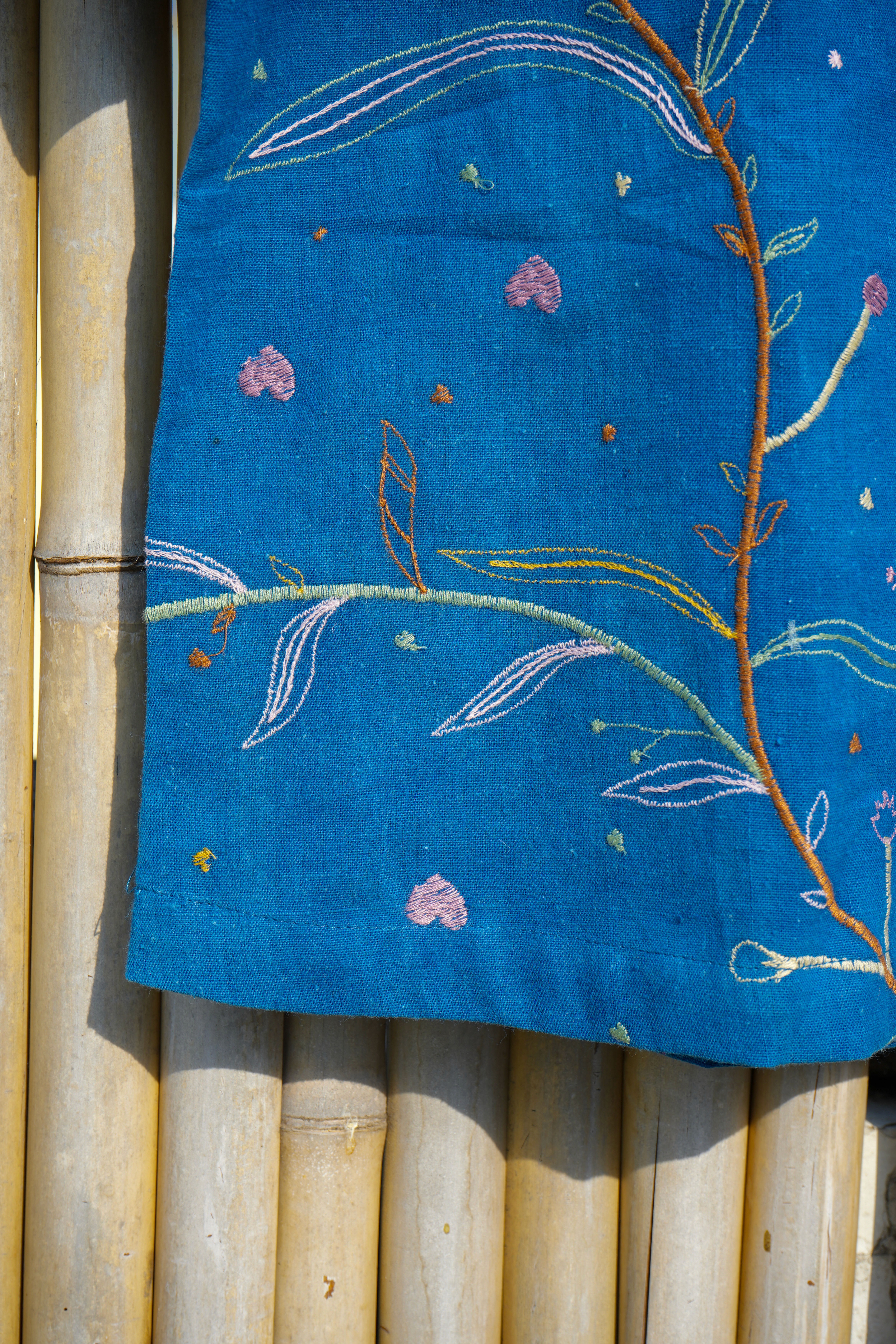 Artisans carefully embroider the design so the lines stay clean and graceful. The stitching enhances the natural texture of the hemp fabric.