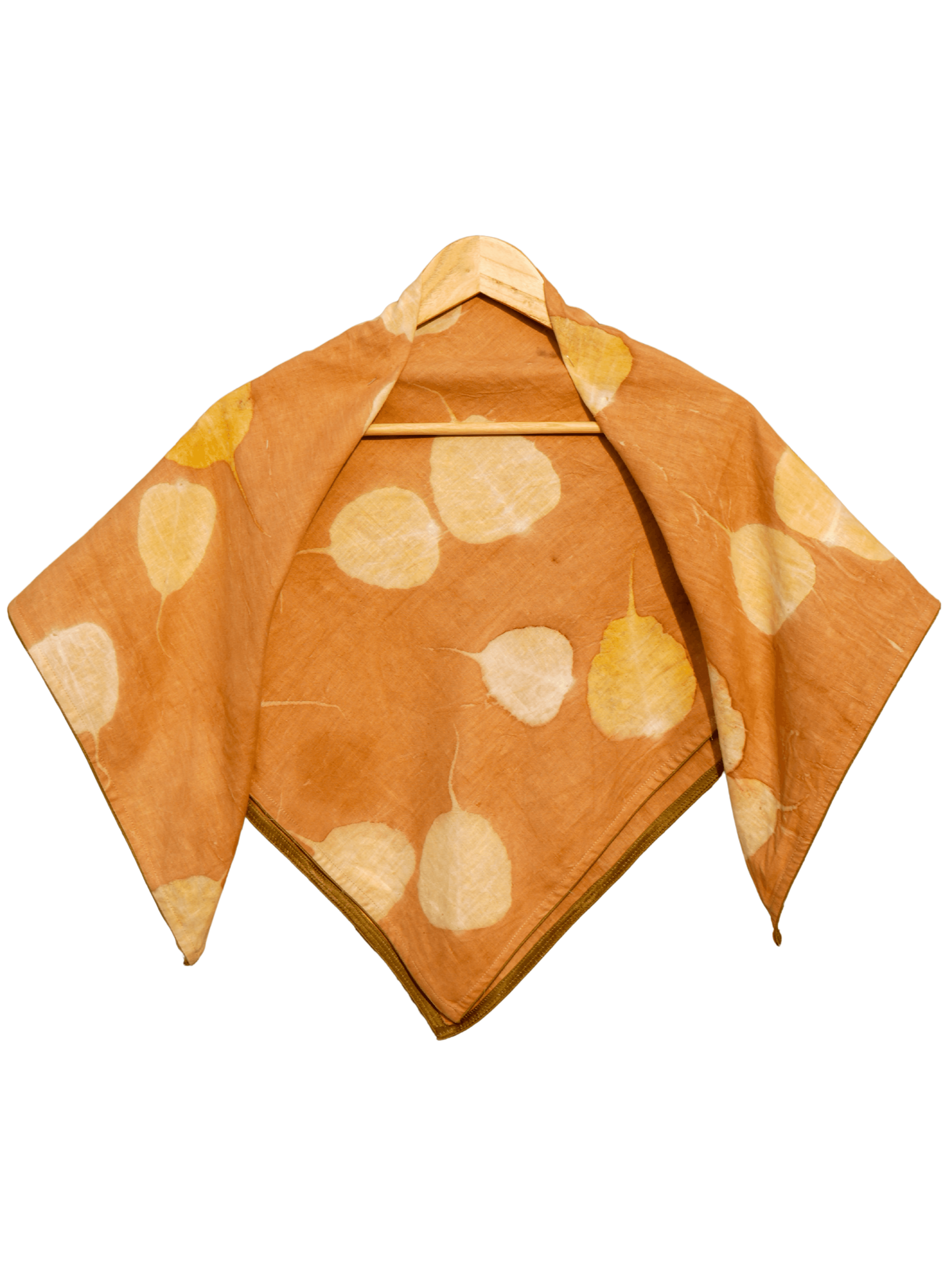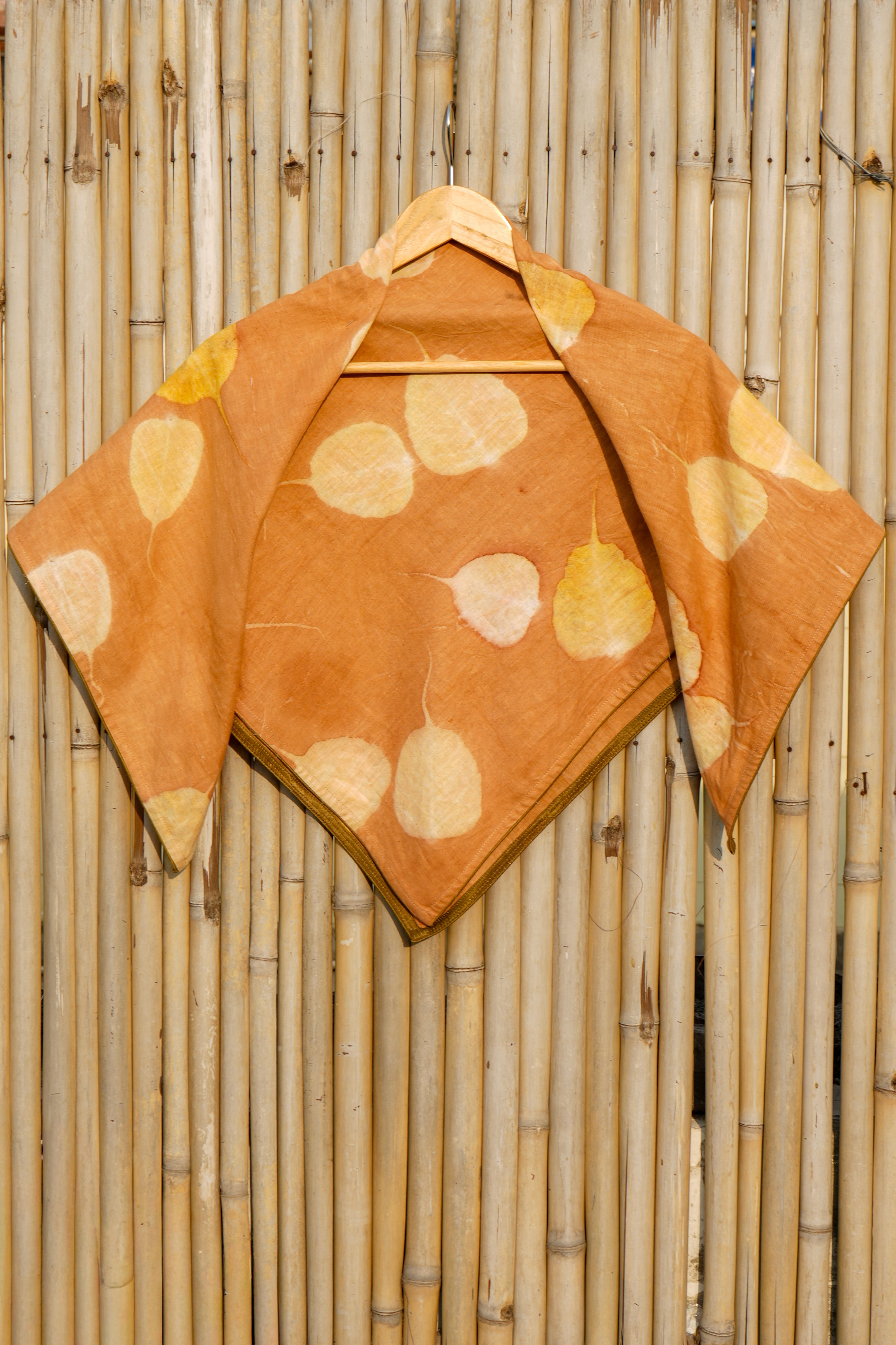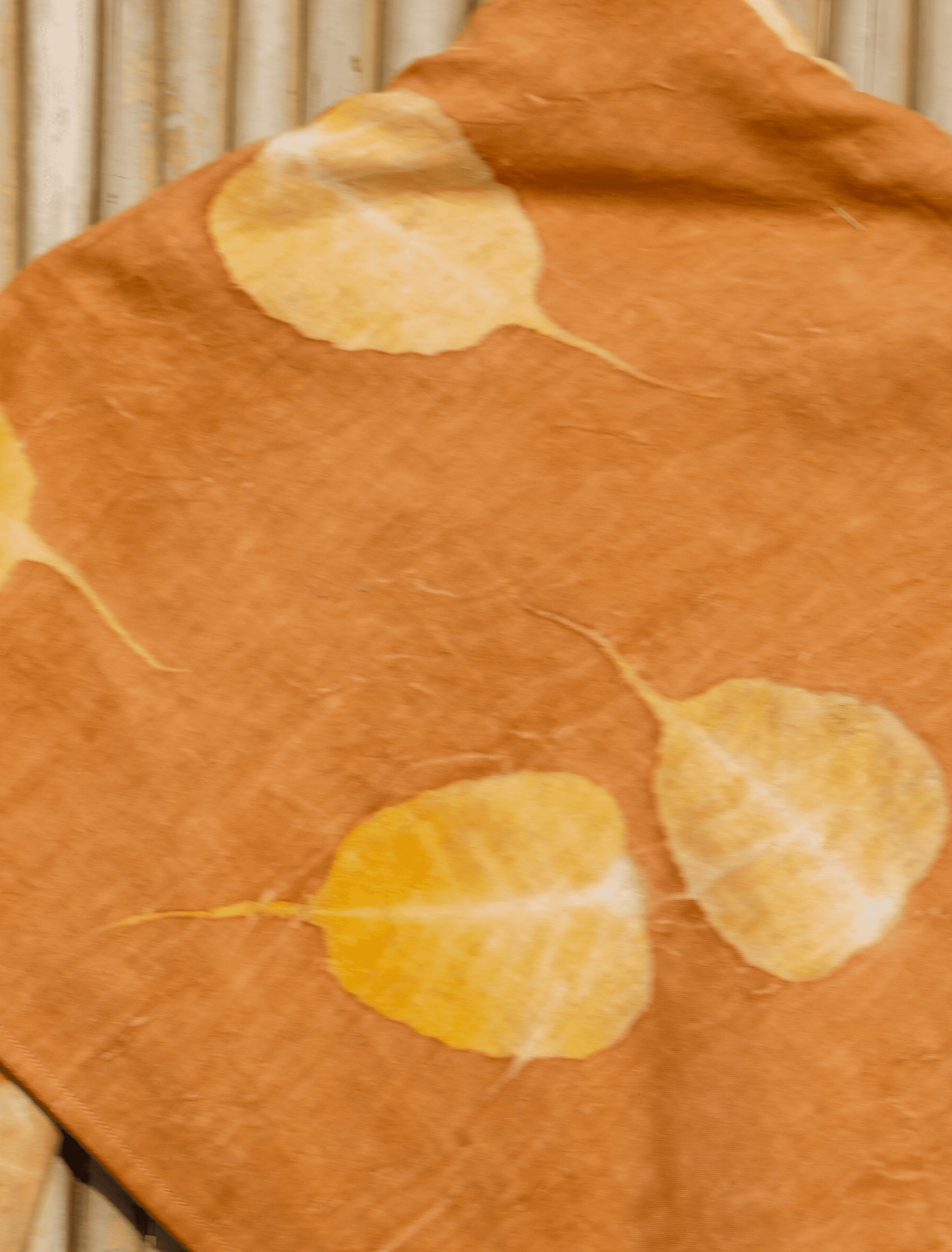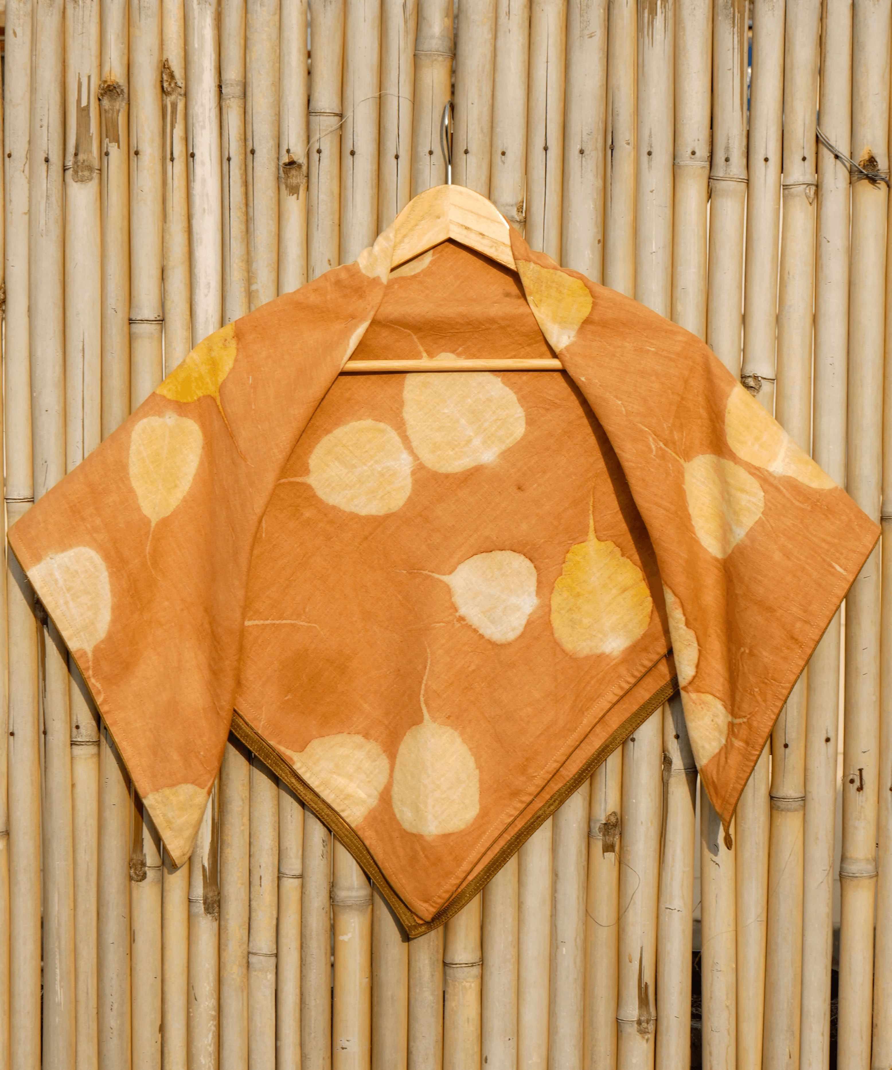Artisans dye the fabric with walnut hulls to achieve the earthy mocha tone, then bundle-steam peepal leaves to imprint their natural forms.