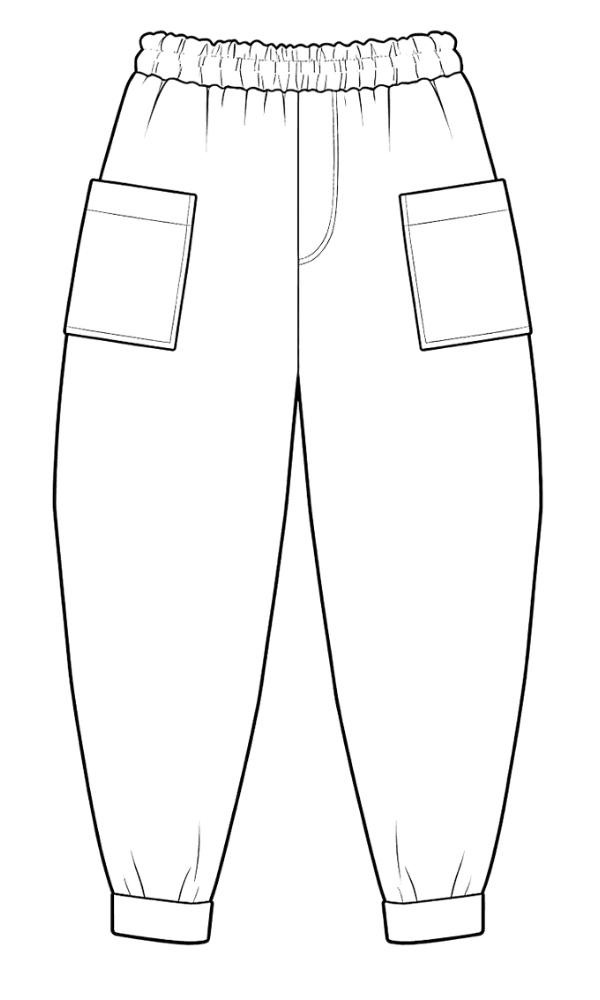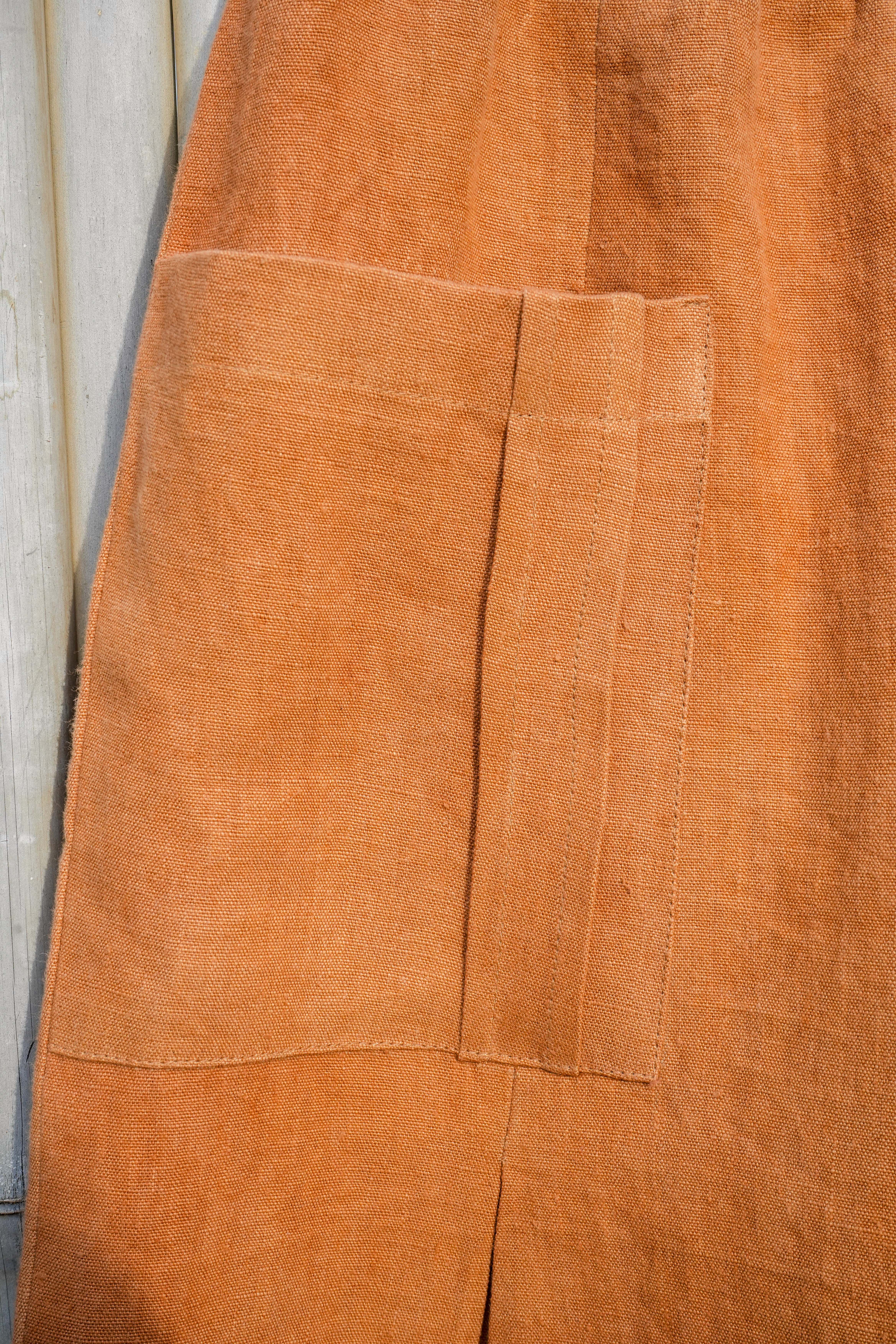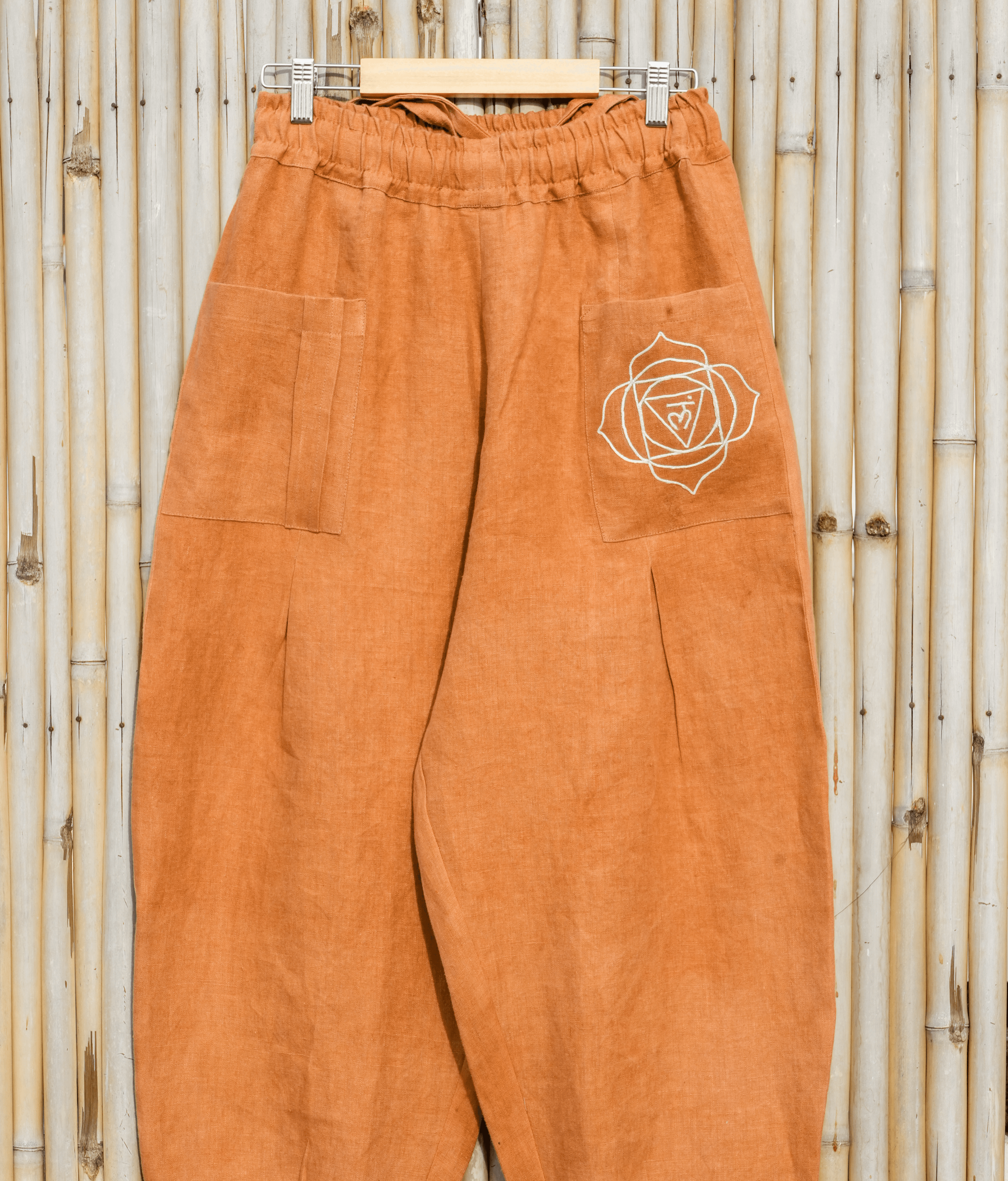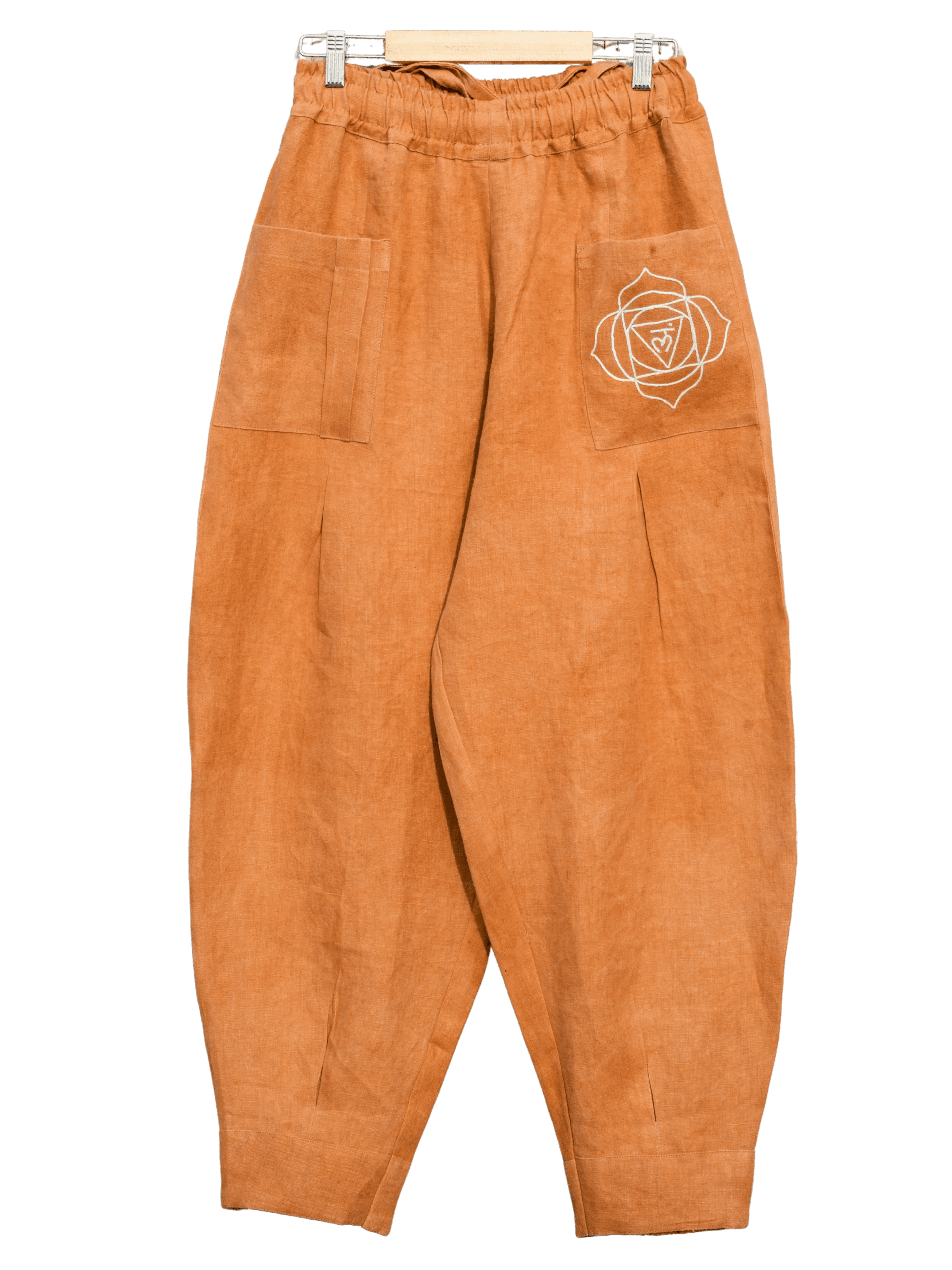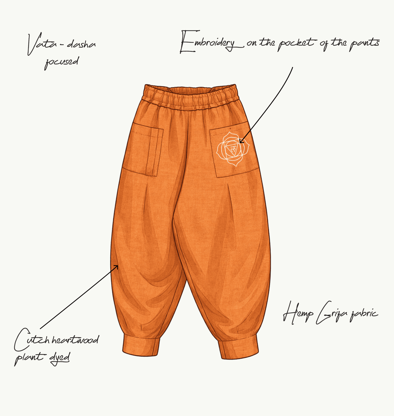 The finished pants offer gentle structure and comfort, helping steady the body and calm the nervous system during movement or rest.