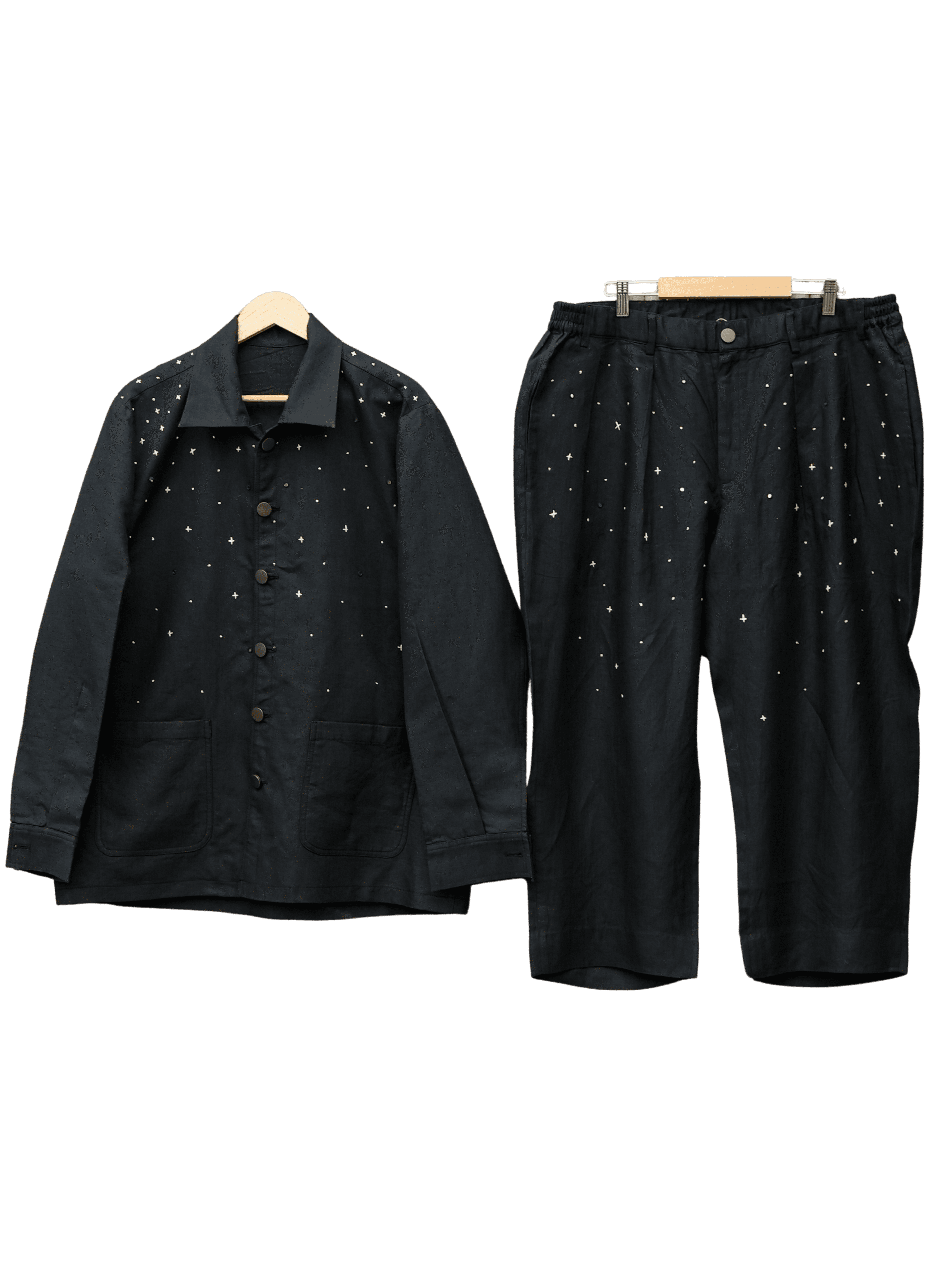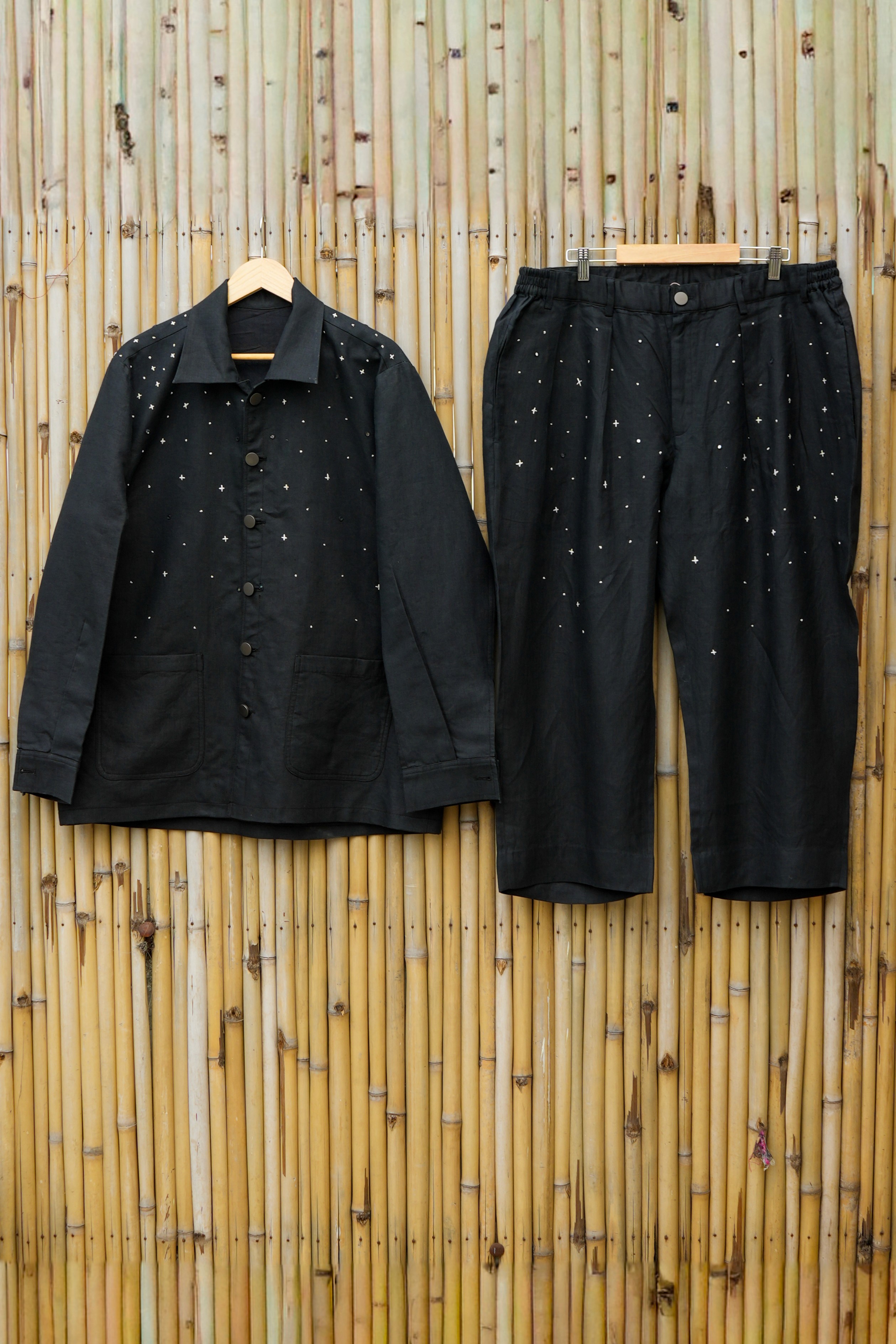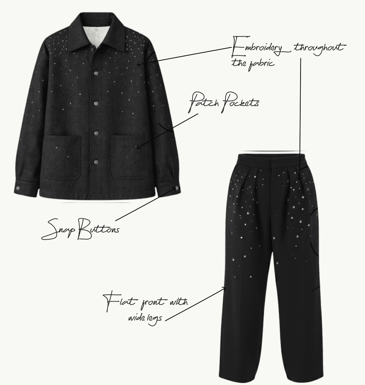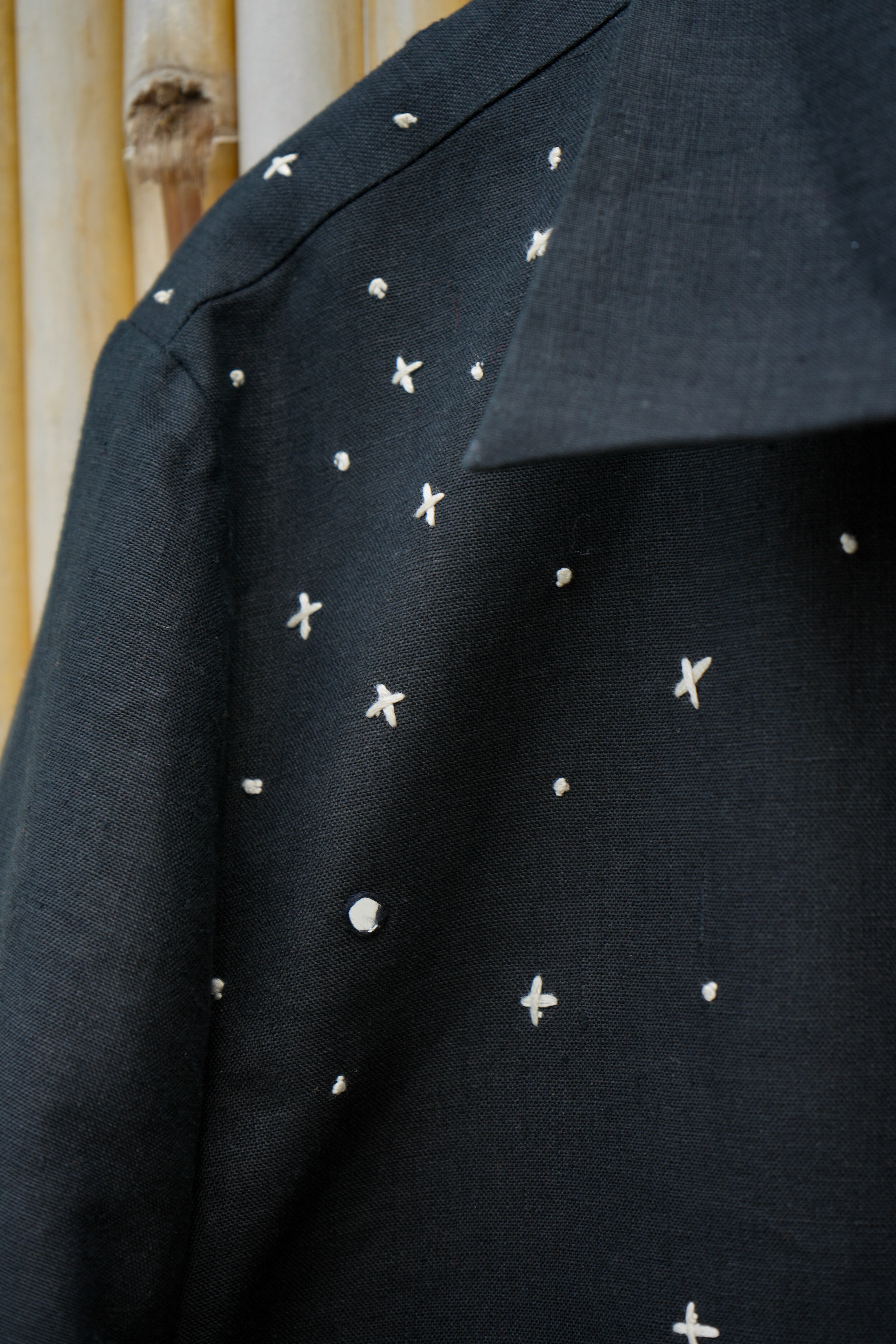 The silhouette was kept relaxed yet refined, a balanced canvas for the embroidered cosmos. Black became the universe, the stitches its living energy.