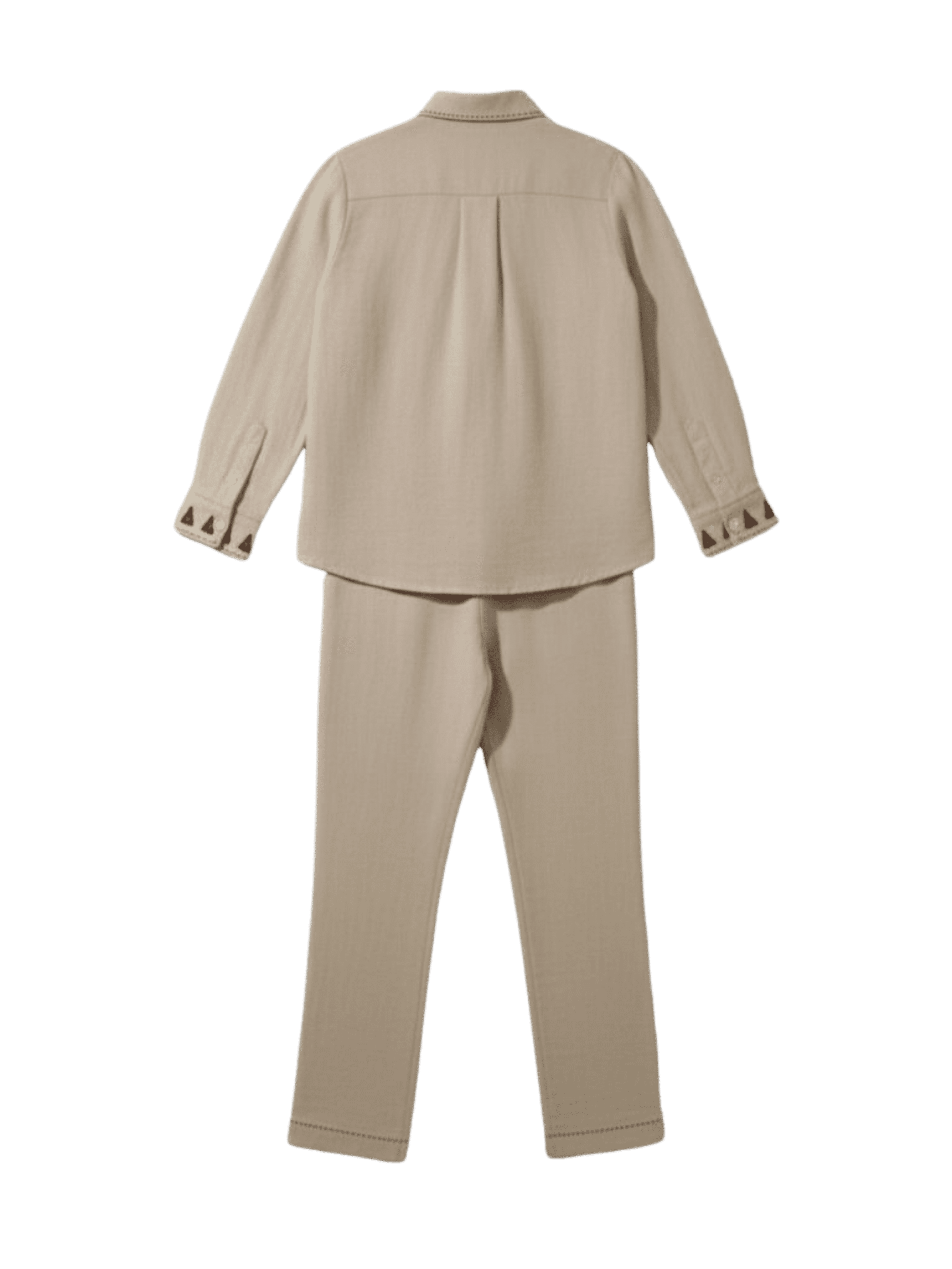 A relaxed shirt paired with easy trousers creates effortless flow. The embroidery placement adds charm without overpowering the simplicity.