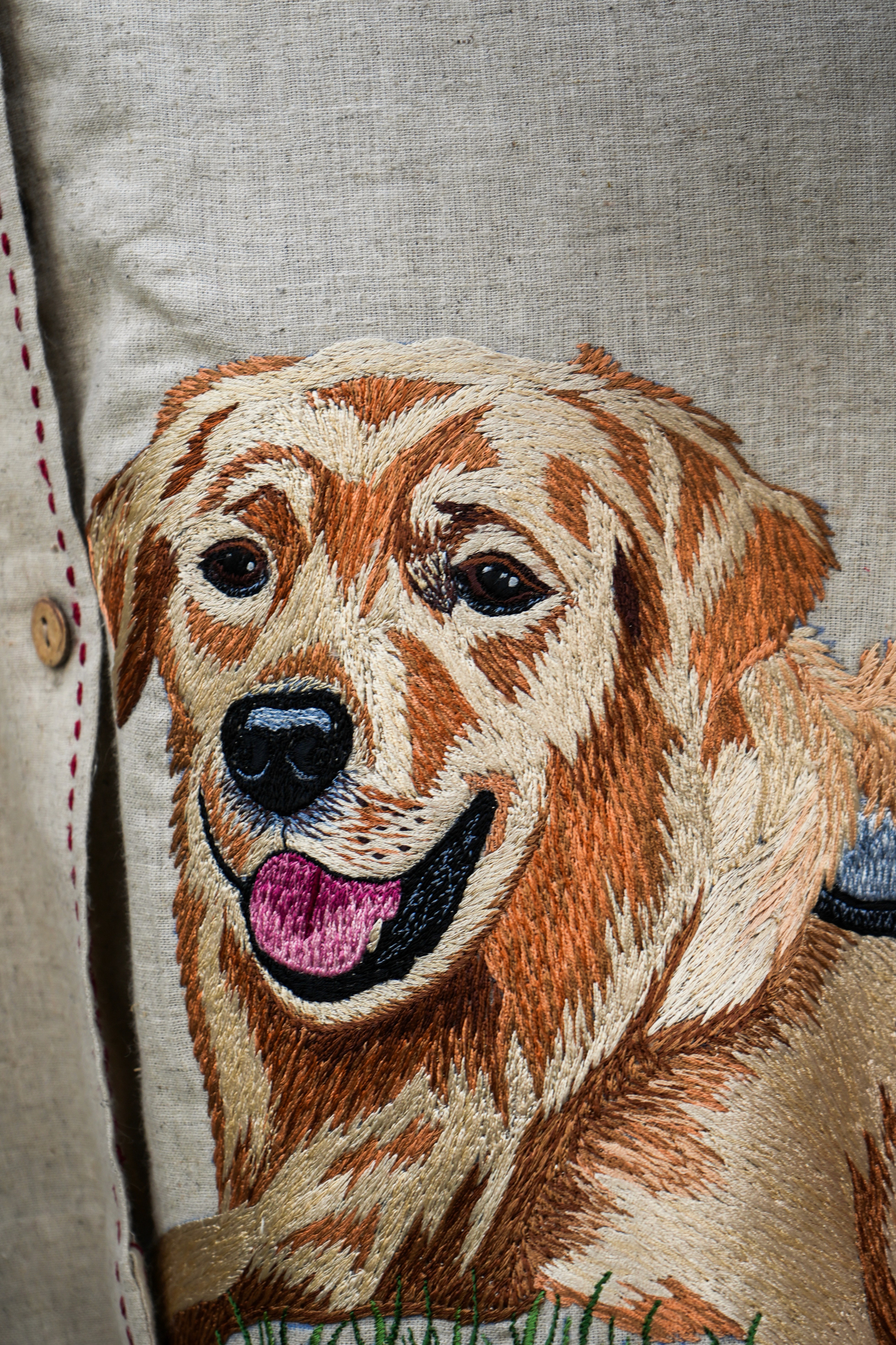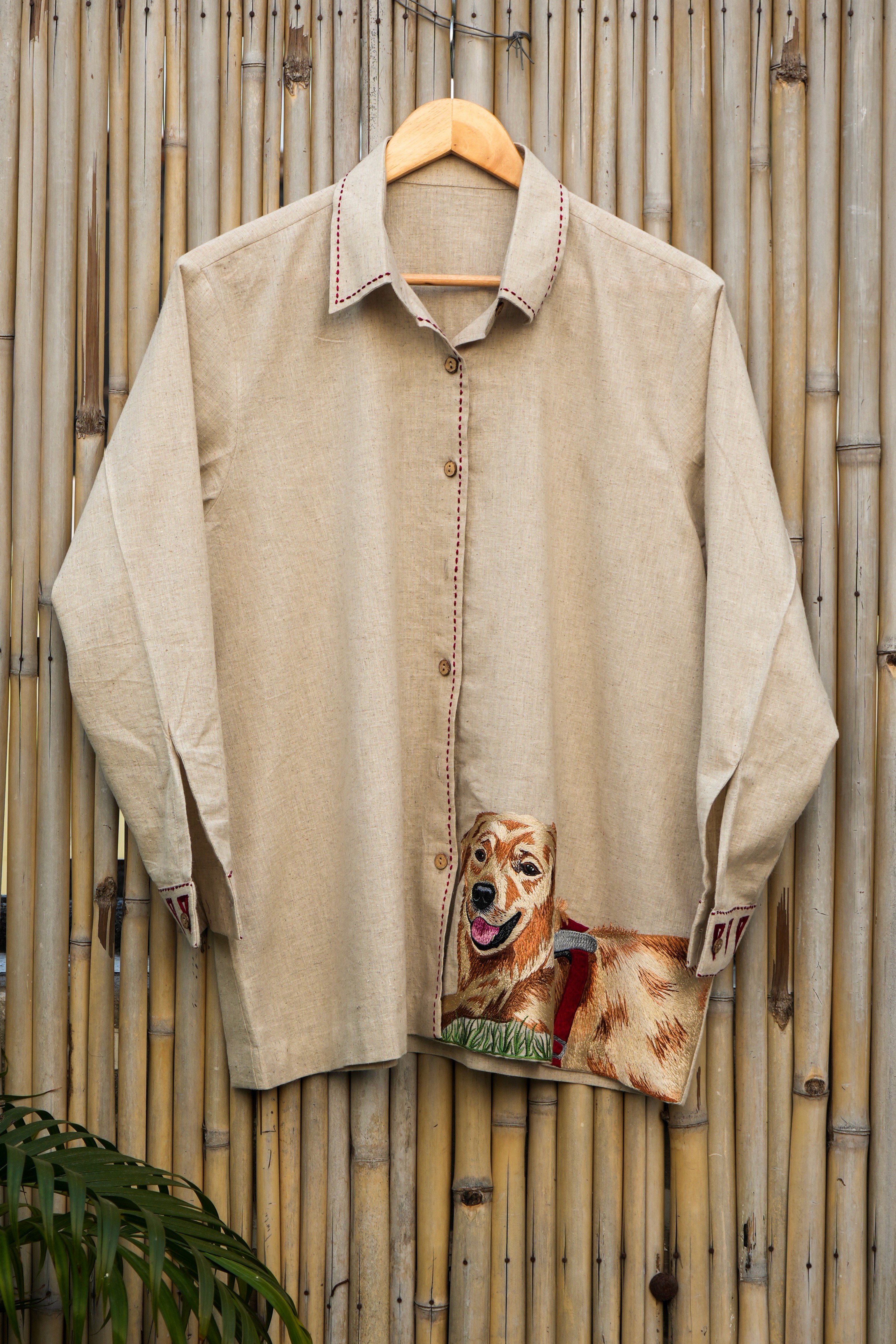 Careful stitching preserves the natural drape of hemp cotton. The machine embroidery is precisely executed to capture every expressive detail.