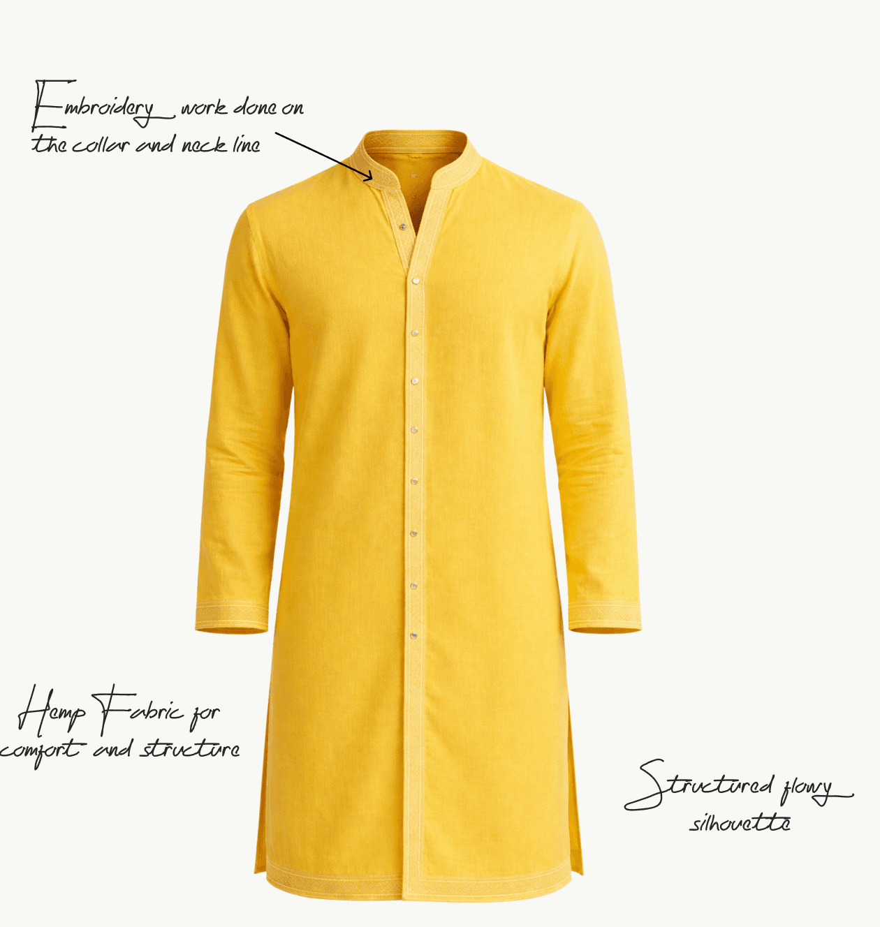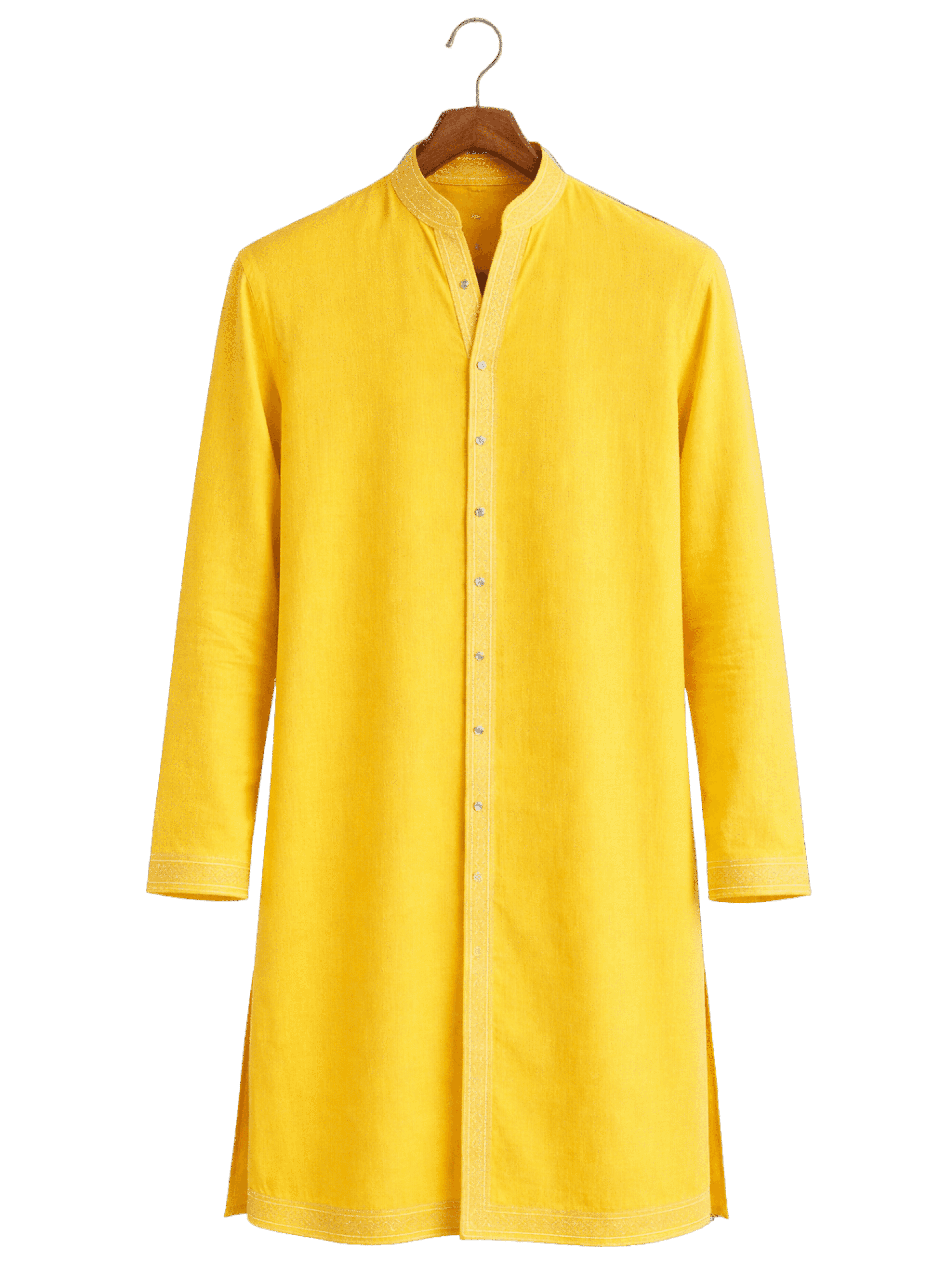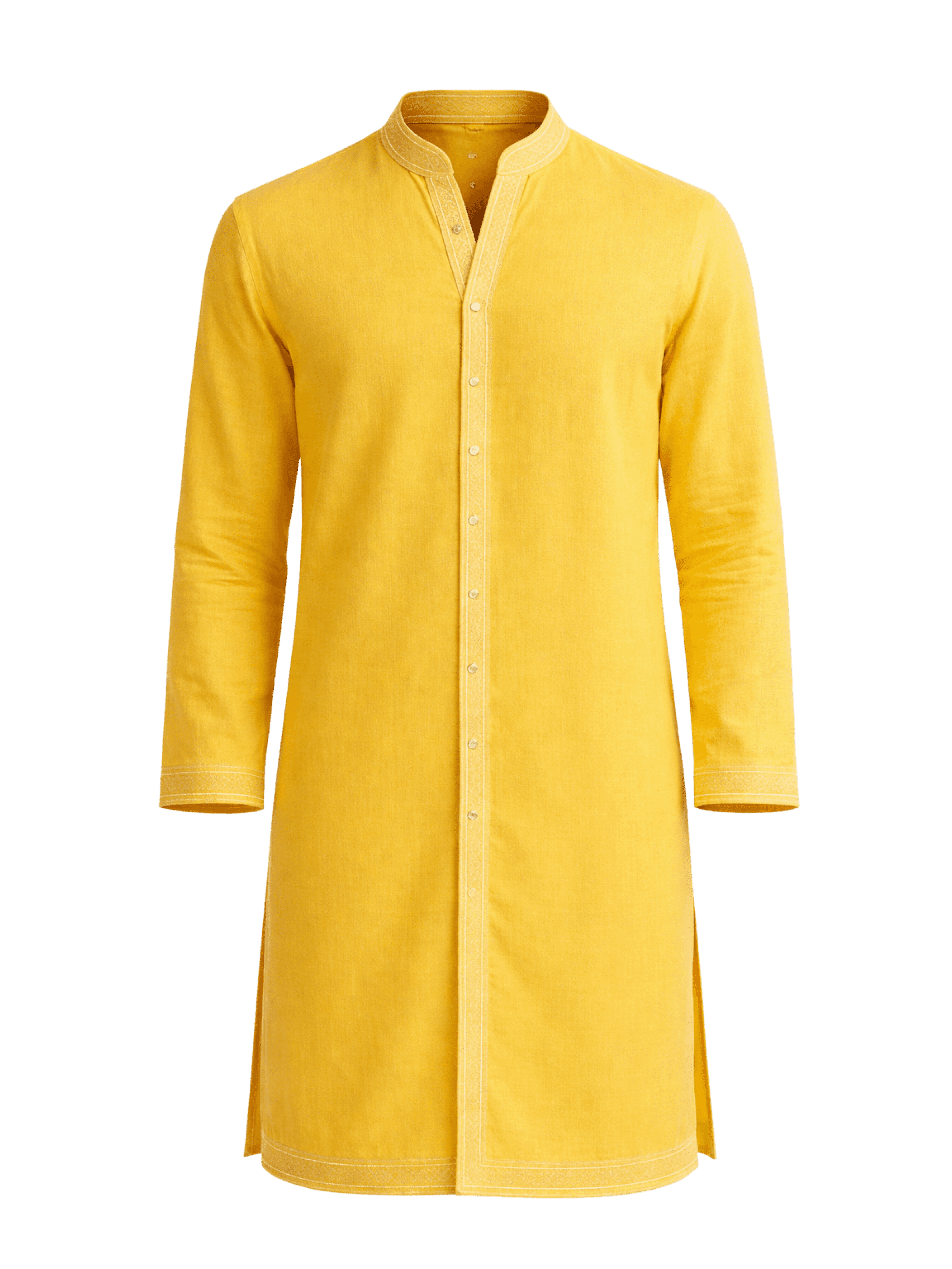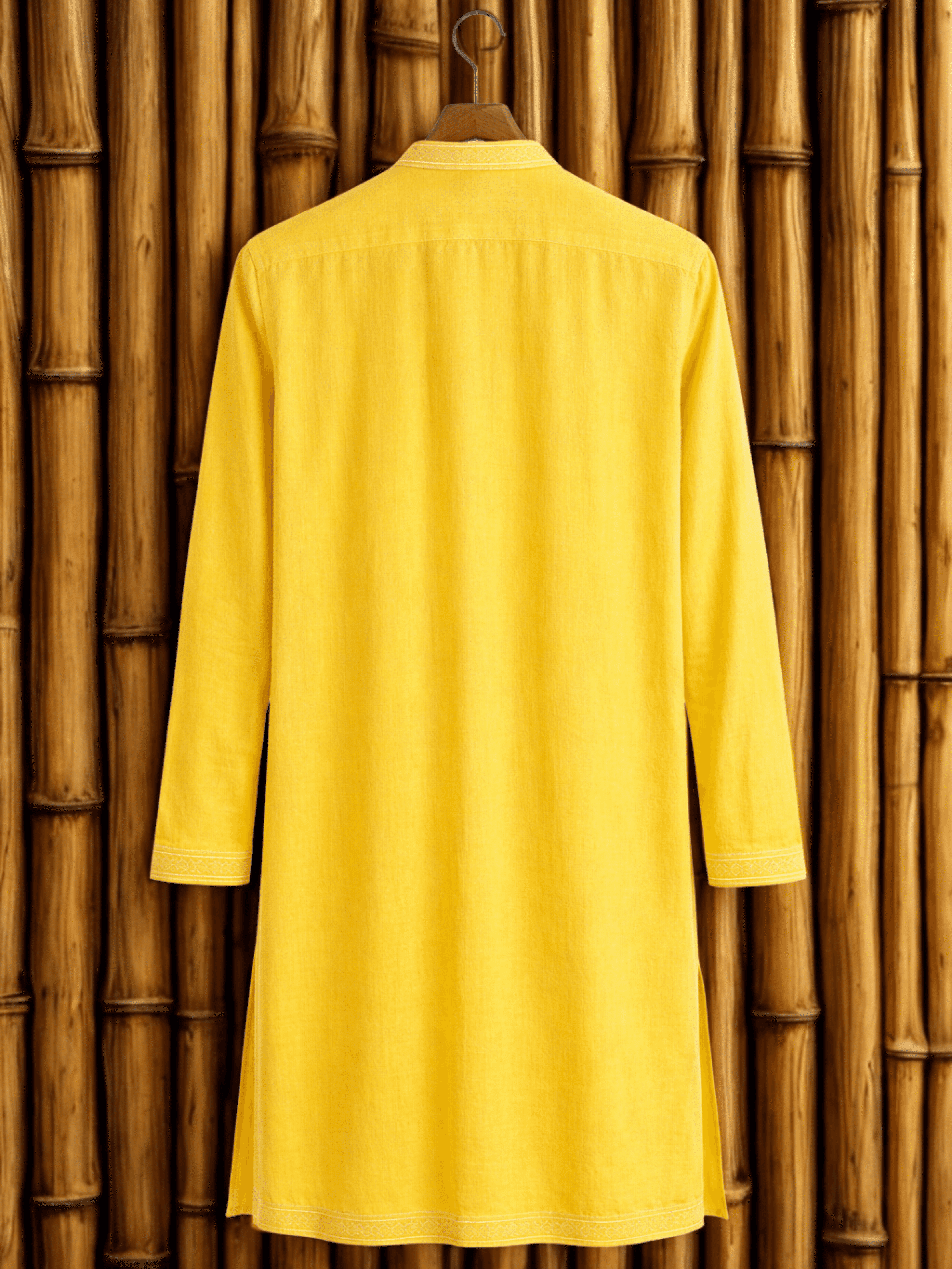 The kurta embraces a clean silhouette in radiant yellow, highlighted with delicate embroidered borders.