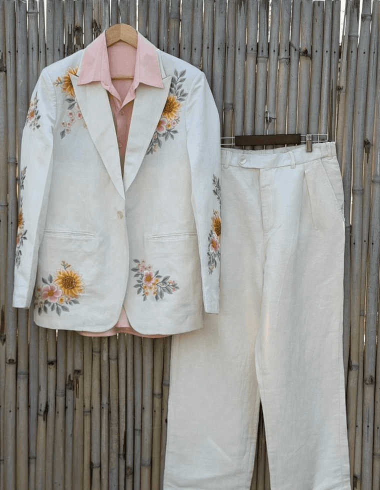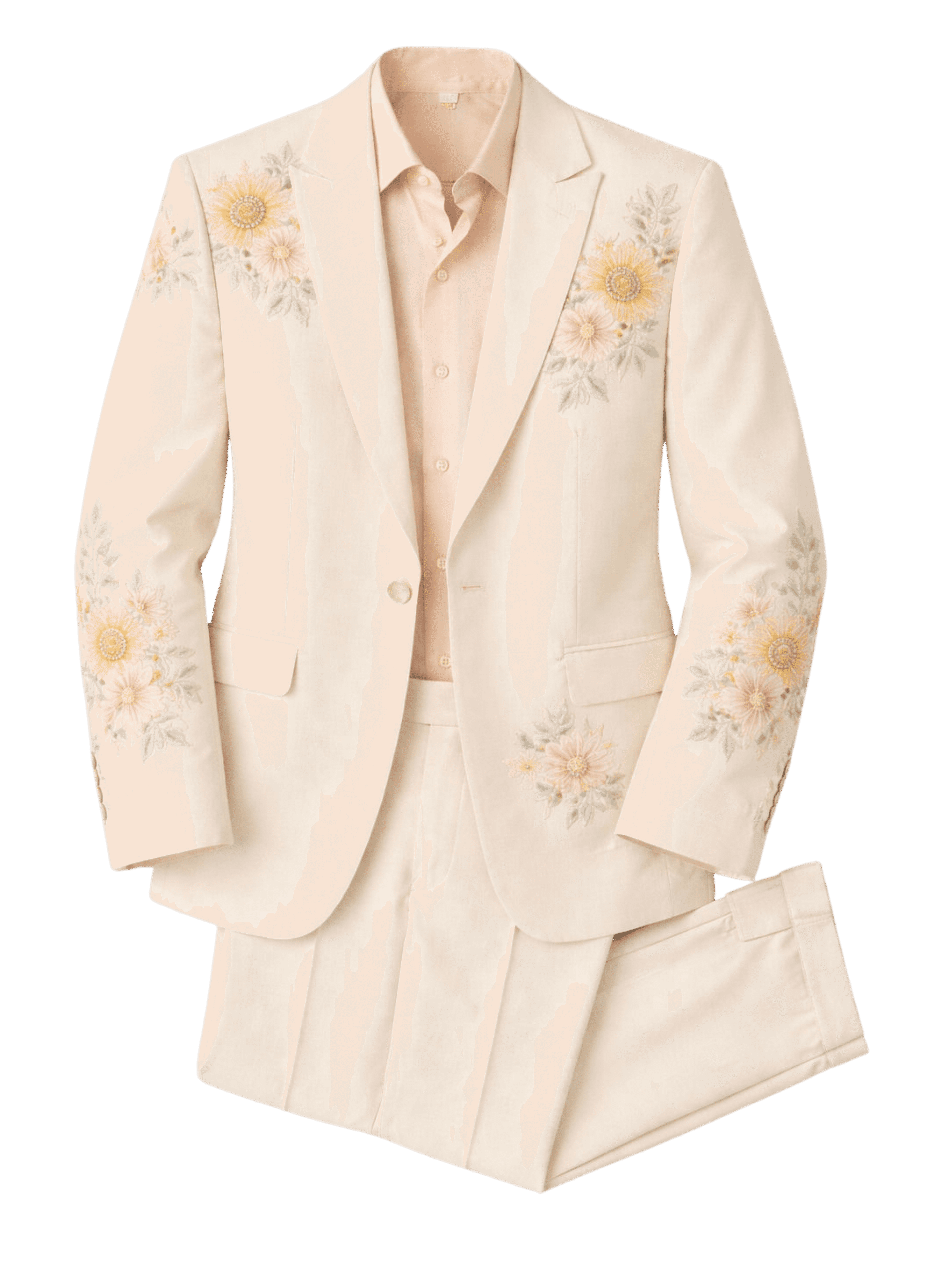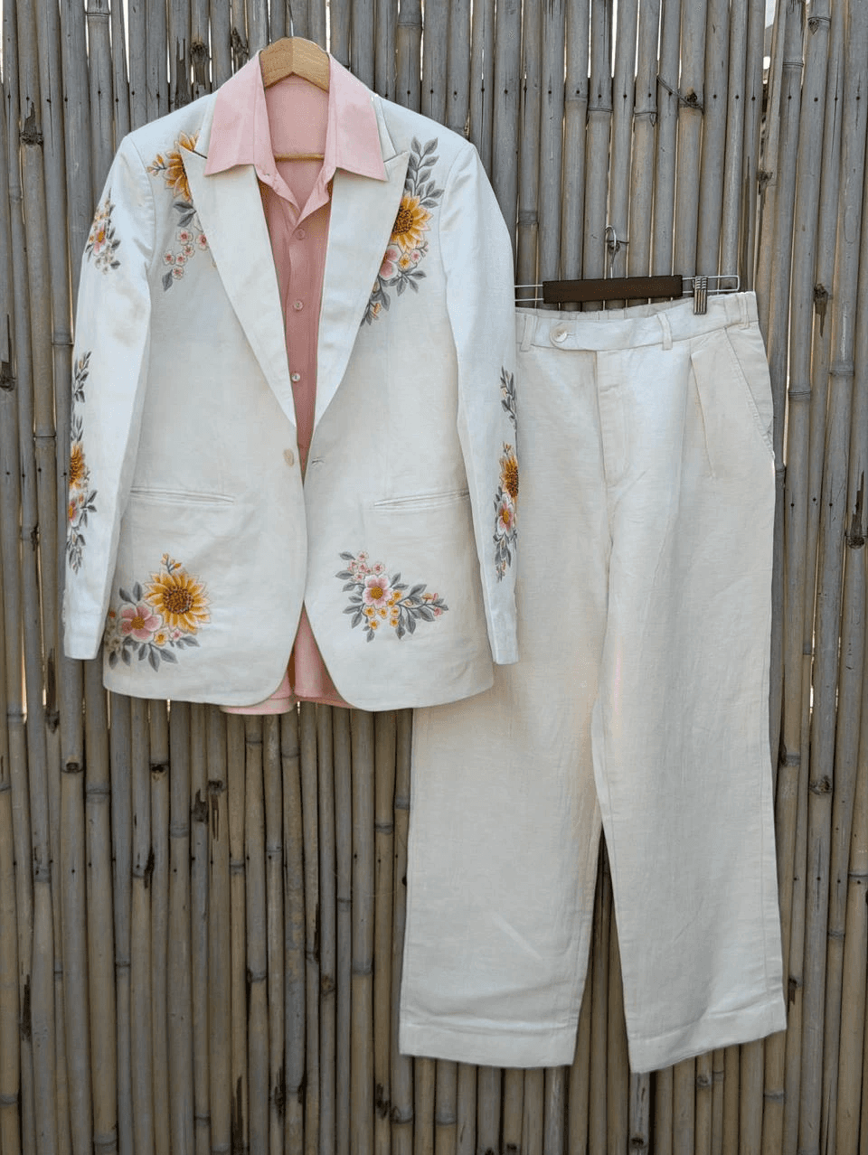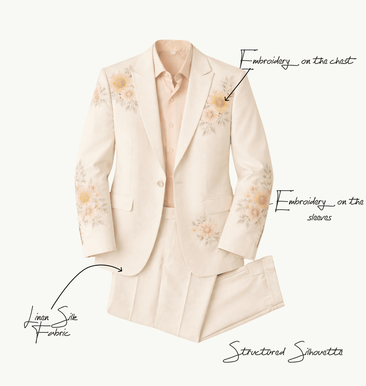 The design balances a soft ivory suit with embroidered floral placements that feel organic and celebratory.