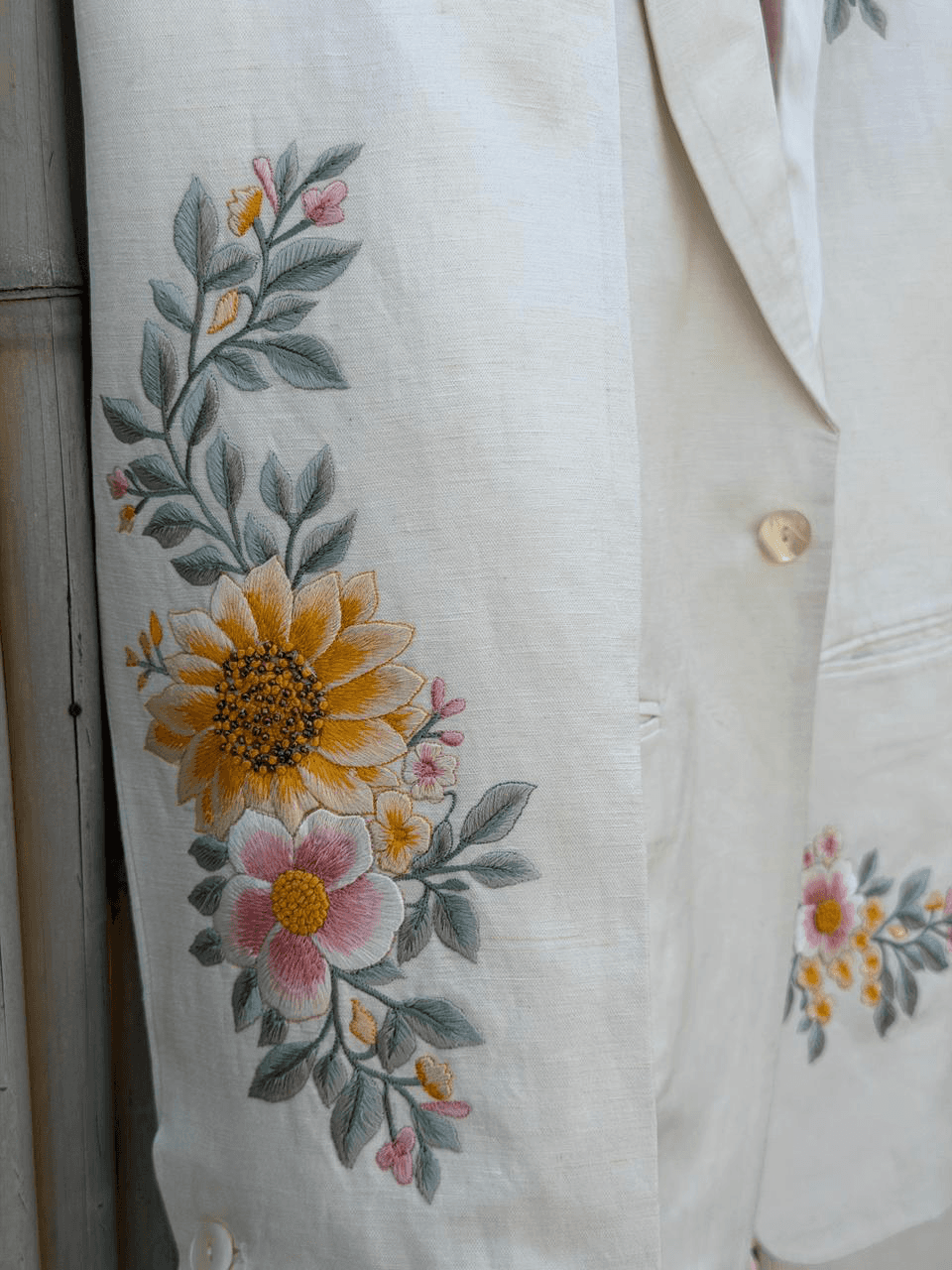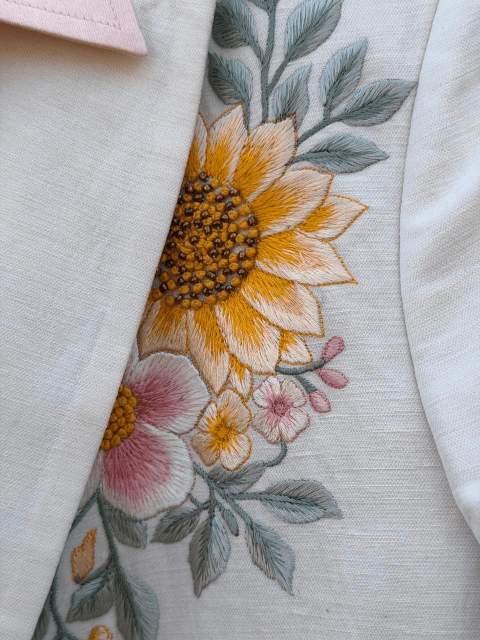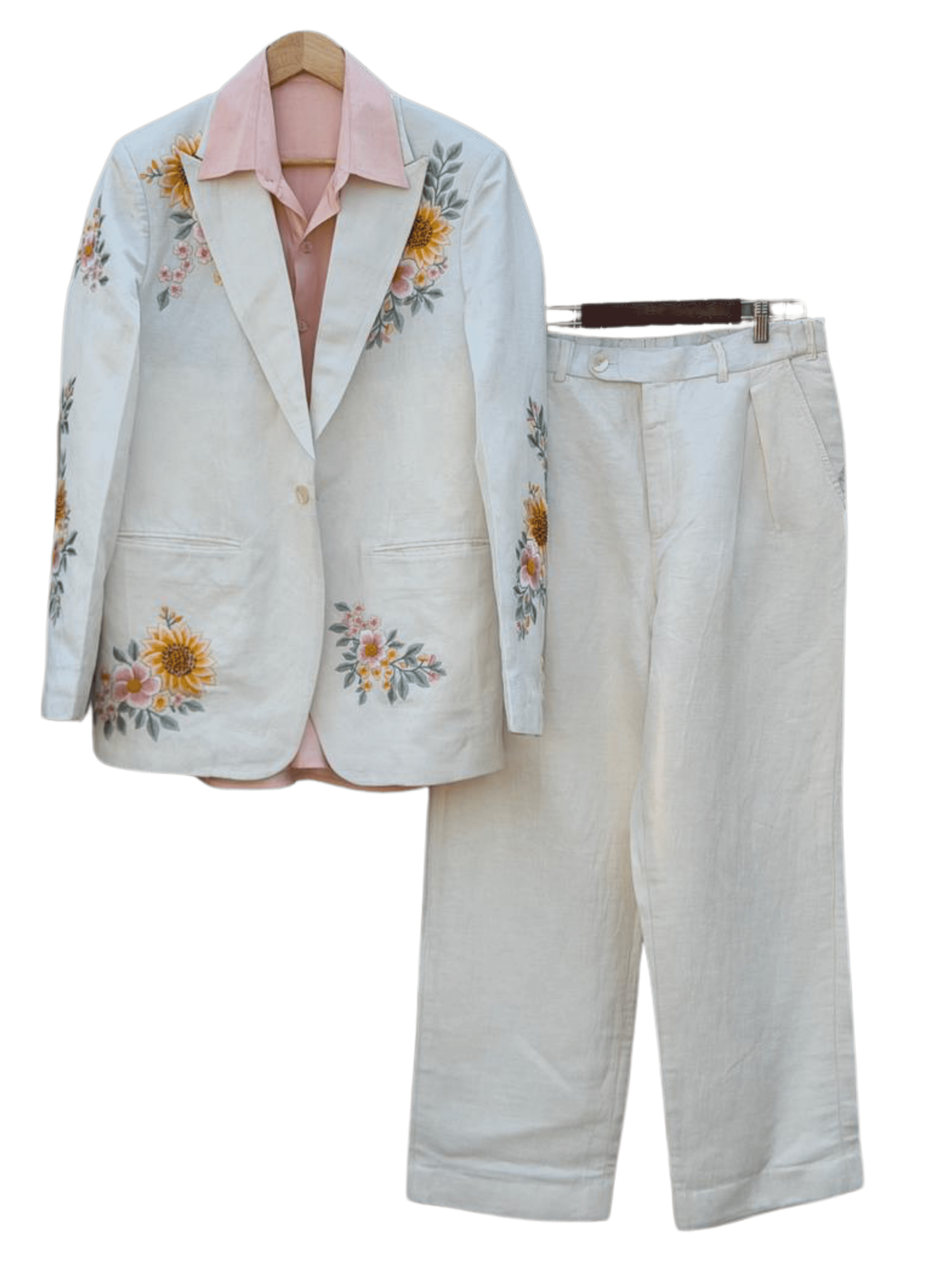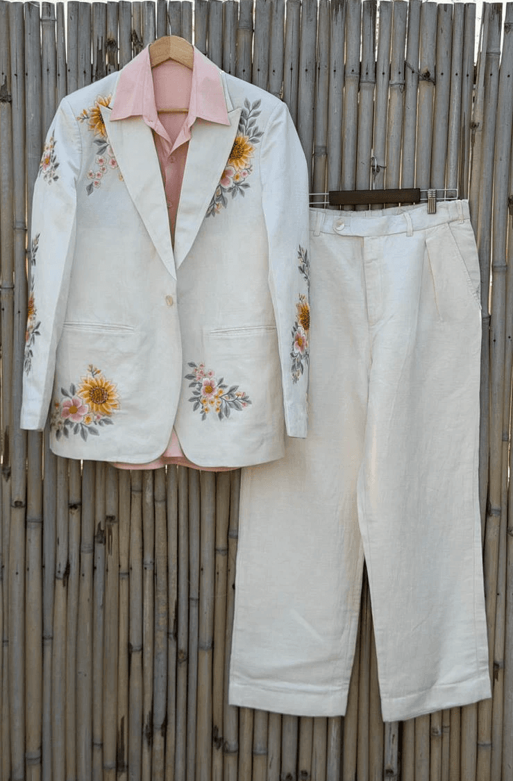 The design balances a soft ivory suit with embroidered floral placements that feel organic and celebratory.