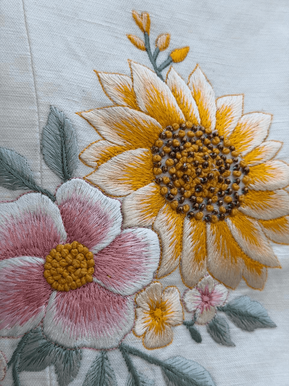 Artisans carefully embroider each floral motif, letting color and thread bring life to the linen silk canvas.